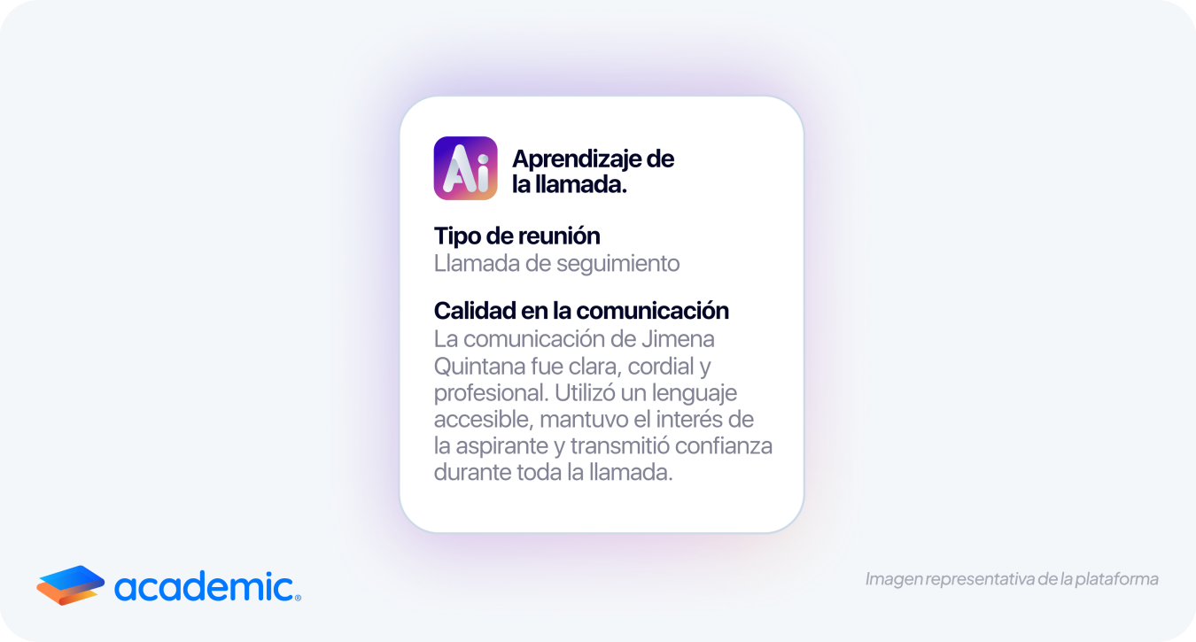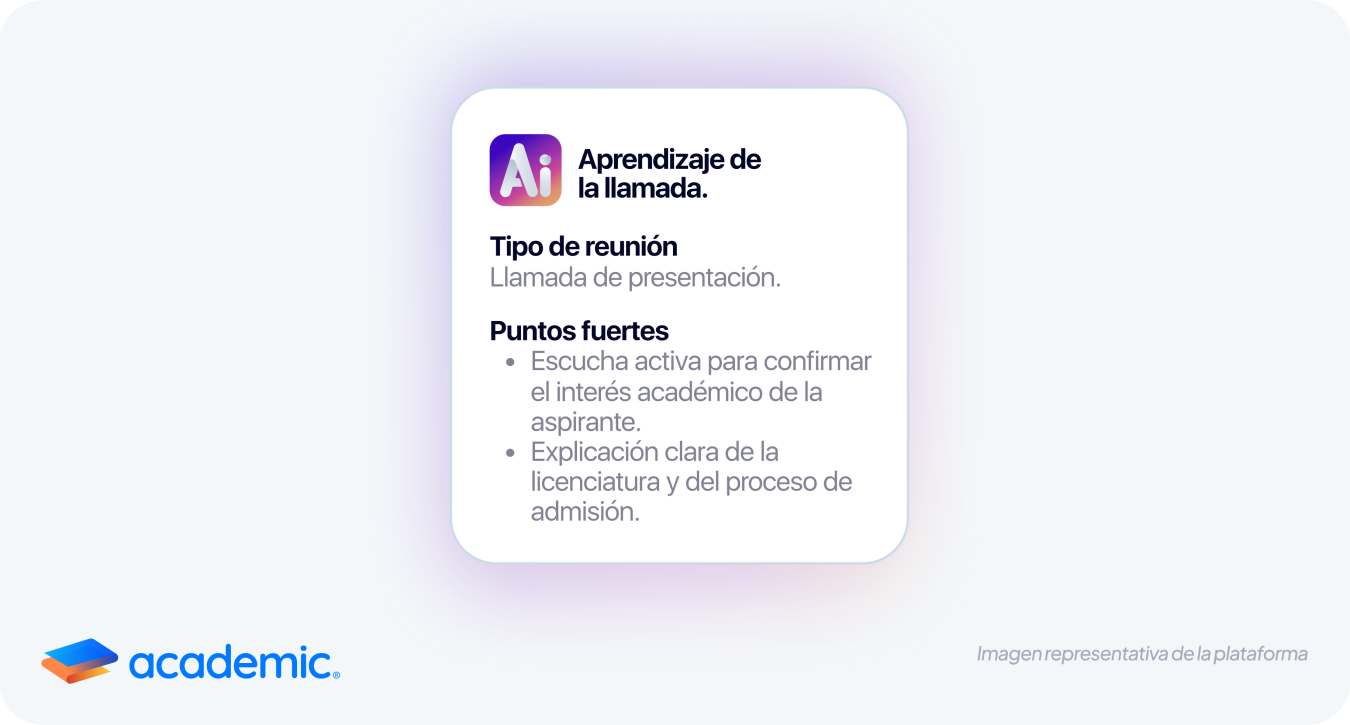 El sistema verifica automáticamente que tu equipo de admisiones mencione los puntos clave y sigan los protocolos institucionales, asegurando un estándar de excelencia en cada contacto.